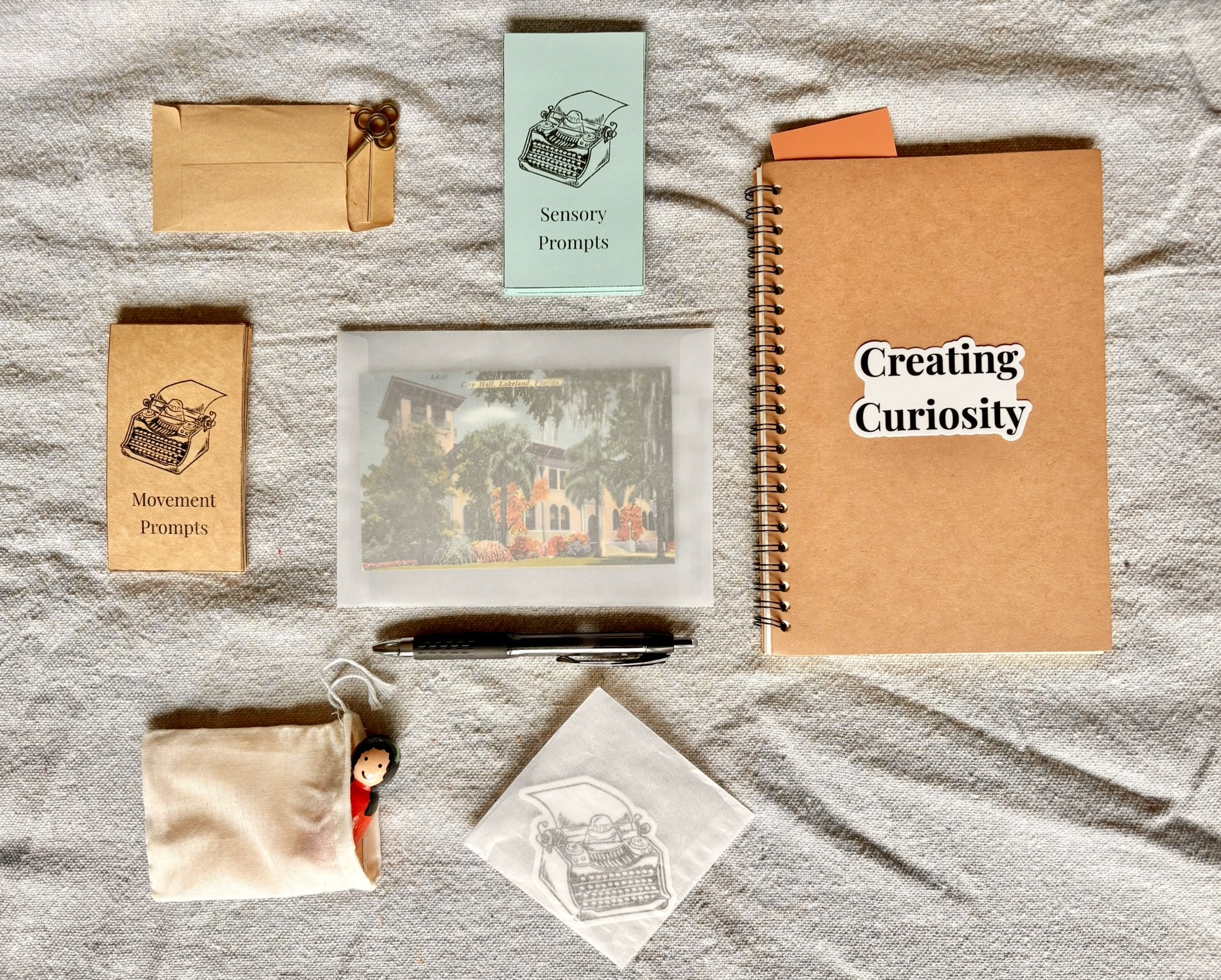 Tactile Objects – hand-painted peg doll, vintage postcard, and ornate key, each paired with a writing prompt