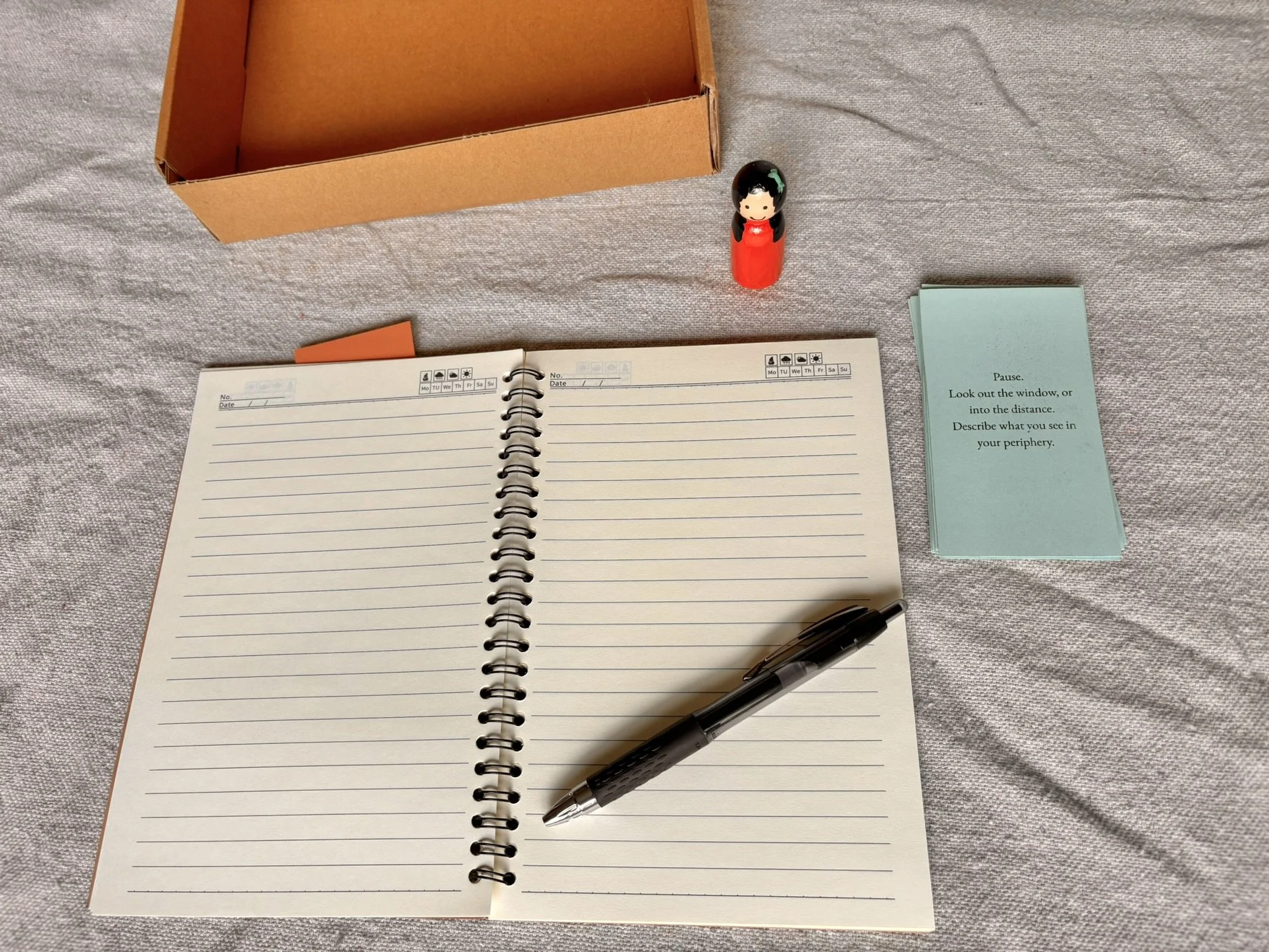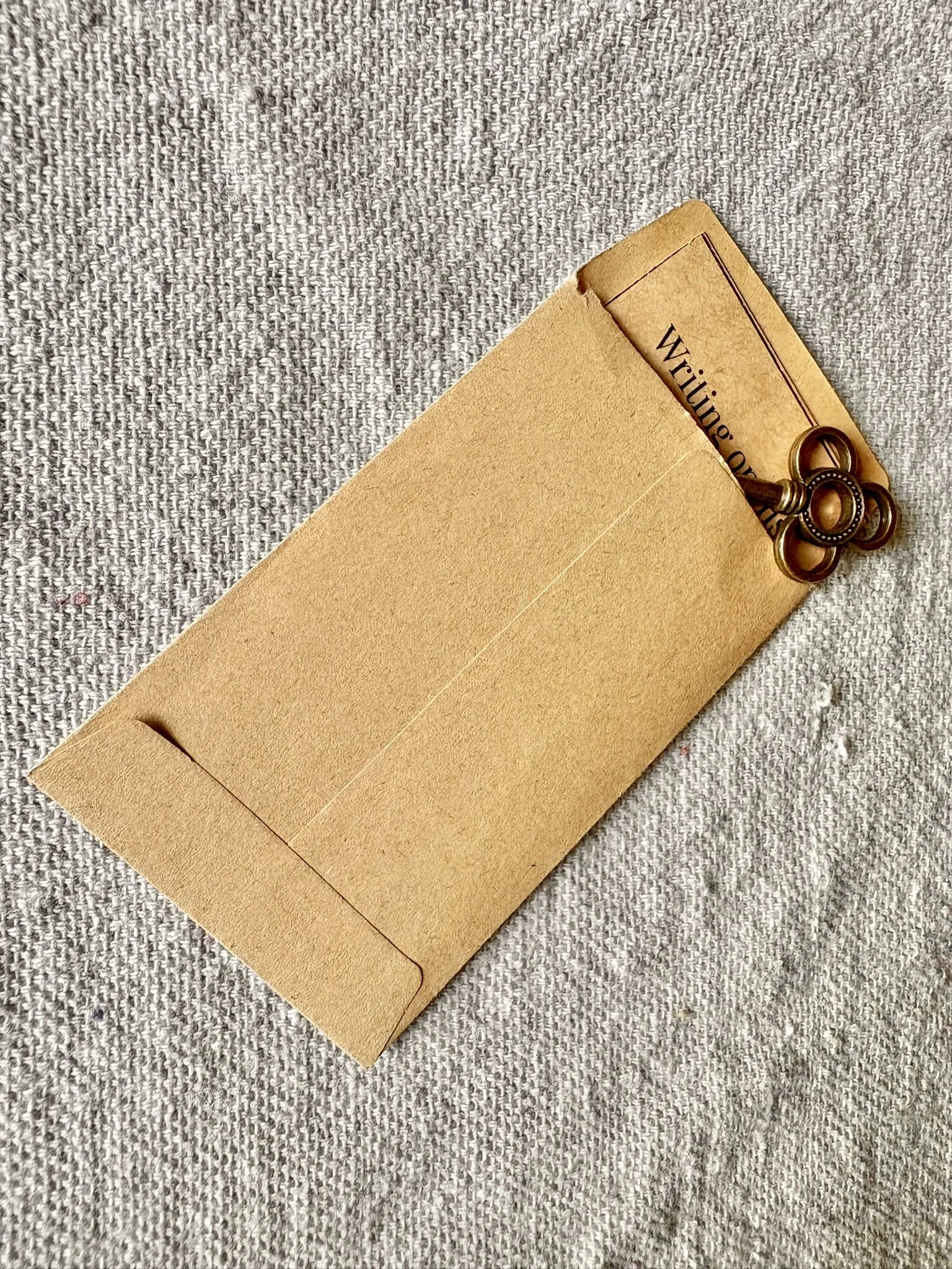 Brown paper envelope holding a pair of vintage brass keys with ornate handles, resting on a gray textured fabric surface.